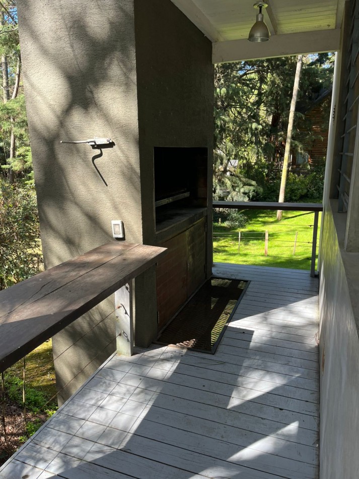 Exterior: deck de madera con muebles, parrilla y cochera cubierta.